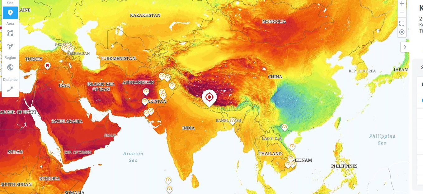 در تصویر پایین،میزان متوسط انرژی تابشی خورشید در یک سال در آسیا و ایران به صورت کیفی نشان داده شده است. هر چه رنگ نقشه قرمزتر انرژی تابشی بیشتر است. میزان انرژی تابشی در مناطق کم تابش ایران در شمال غرب، از پر تابش ترین نقاط اروپا در جنوب اسپانیا و پرتغال بیشتر است.